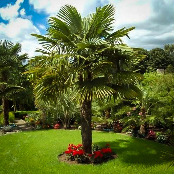 The beautiful green fronds and spiny brown trunk of the Windmill Palm brings a tropical feel to any space.